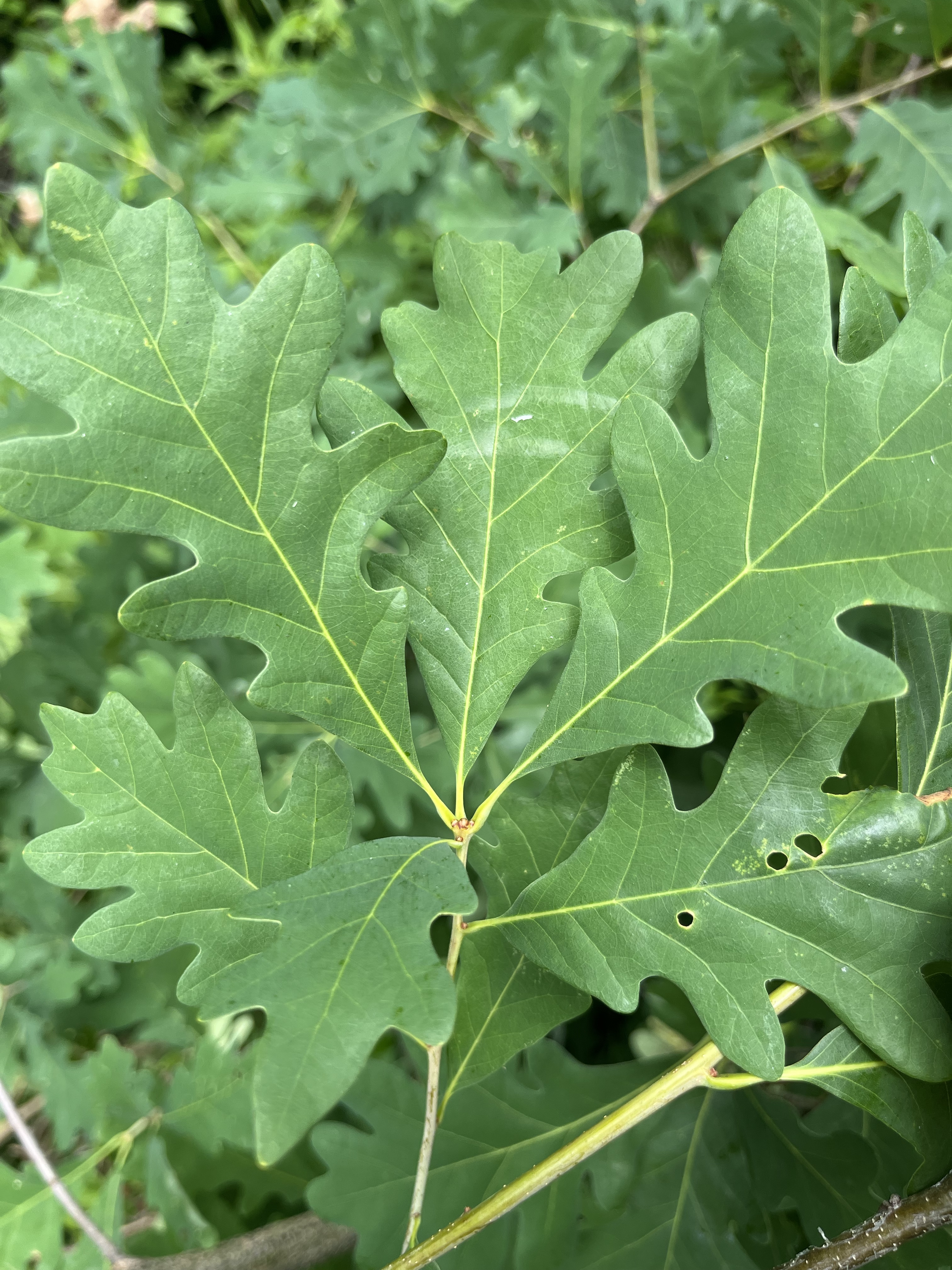 >> CHUNKS OF LEAVES CHEWED DOWN TO THE VEINS, BROWNING LEAVES AROUND THE TOP OF THE TREE CANOPY AND LEAVES FALLING IN SUMMER